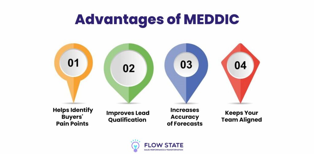 You have most probably heard of the terms MEDDIC, MEDDICC, and MEDDPICC, used interchangeably within the B2B sales training sphere throughout the last few decades. But what do they mean, where do they originate, and why have they proven so successful as a sales methodology for so long? Join us as we unpack the MEDDIC sales process; who created MEDDIC, how to use it within your sales teams, what makes it so effective, and what types of questions you should use with the technique. This guide will aim to not only help you and your sales team understand the fundamentals of the MEDDIC sales process but also use practical examples and techniques to upskill, qualify leads, and close deals effectively.What is MEDDIC and What Does It Stand For?So, what is the MEDDIC sales process, and who invented MEDDIC? MEDDIC is an acronym for a sales framework or methodology created in 1996 by Dick Dunkel while working at PTC (Parametric Technology Corporation). Dunkel aimed to enhance the effectiveness of the sales teams and, upon examining why PTC was winning, losing, or delaying deals, he identified six key factors common to all outcomes. These factors were encapsulated in the acronym MEDDIC. With the support of John McMahon, PTC’s Chief Revenue Officer, and Jack Napoli, known as ‘The Godfather of MEDDIC,’ this sales methodology quickly spread beyond PTC, influencing thousands of sales teams globally.MEDDIC stands for: Metrics, Economic Buyer, Decision Criteria, Decision Process, Identify Pain, and Champion. MEDDPICC is a variation of MEDDIC that has evolved to include a P that stands for Paper Process and an additional C that stands for Competition. Image via Flow StateNow, let’s break down the various components of the MEDDIC sales process.MetricsMetrics refer to the relevant, quantifiable outcomes that a prospect aims to achieve. These could be revenue growth, cost savings, or any other measurable result that aligns with the prospect’s specific industry and goals. The best MEDDIC questions to uncover metrics might include:What are your primary business objectives for this year?Can you quantify the potential impact of solving this problem?What metrics will determine the success of this project?For example, for a web hosting company, promising a metric of increased page load times of 12% isn’t adding that much. You need to identify what their biggest pain point is and tie that to measurable metrics that make a difference to them, not just something that sounds good in a pitch. Use metrics in storytelling to showcase how you have solved a client’s problem before, giving metrics that show how the problem was solved.Economic BuyerThe Economic Buyer is the person with the authority to make purchasing decisions. More than just buying power, though, they have the knowledge, perspective, understanding, and energy to commit to a meaningful purchase.Identifying this individual early in the sales process is crucial. Questions to identify the Economic Buyer include:Who will be responsible for the final decision on this purchase?What is the approval process for investments of this nature?Who else will be involved in the decision-making process?Decision CriteriaDecision criteria are the specific factors that influence the prospect’s purchasing decision. Understanding these criteria helps tailor the sales pitch. The best MEDDIC questions to determine decision criteria include:What are the key factors you consider when making a purchase decision?How do you prioritise these criteria?What are the most important features you are looking for in a solution?Decision ProcessThe Decision process outlines the steps the prospect will take to make a purchasing decision. Knowing this process helps in aligning sales activities accordingly. These fall into three categories:Technical: Can the solution meet technical needs? Is it easy to implement and secure? Is the interface user-friendly?Economic: Does it offer a strong ROI? What are the financial and resource costs?Relationship: Does the customer trust and want to work with you? Are their goals aligned with your solution?If the customer already has clear decision criteria, ensure your solution aligns well with them. If not, use this opportunity to highlight the strengths of your solution. Either way, it must not be forced — the salesperson must link their value proposition to the Decision Criteria, adapting it to emphasise unique or different strengths. Additional questions to help map out the MEDDIC decision process can include:Can you walk me through your decision-making process?What are the key milestones in this process?Are there any potential roadblocks we should be aware of?Identify PainIdentifying pain means just that; it involves understanding the challenges and issues the prospect is facing that your product or service can solve. MEDDIC, as a framework, now also includes “Indicate” and “Implicate” as part of this, meaning to delve even deeper into exactly how and why the pain points affect the client or prospect, with the idea to be better informed to ease the pain. MEDDIC questions to uncover pain points include:What are the biggest challenges you are currently facing?How do these challenges impact your business?What have you done so far to address these issues?Unlock your buyer’s true pain points with open-ended discovery questions, instead of jumping to conclusions from the first meeting. Engage in genuine, holistic conversations that let your buyer reveal their challenges and obstacles. This approach allows you to dive deeper into the underlying causes and structures of these issues. By truly understanding the business’s pain points, you set the stage to identify and build relationships with your Champions.ChampionA champion is a respected stakeholder within the prospect’s organisation who is literally championing on your behalf — an ally and advocate who supports your solution and helps navigate the internal decision-making process. Th